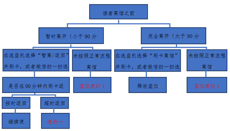 1.闭馆前30分钟读者可以到选座机选择“刷卡离馆”,系统将保留座位至闭馆。