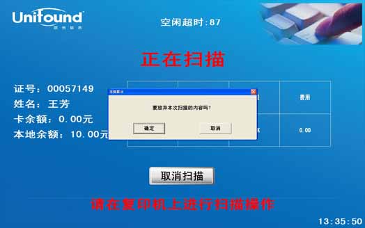 此次刷卡将终止本次扫描任务,并对您本次的扫描任务进行金额结算。(如果您忘记刷卡退出,请不要担心,在机器闲置超过90秒后,系统仍然会终止本次扫描并对您本次的扫描进行金额结算)。 如图五所示: